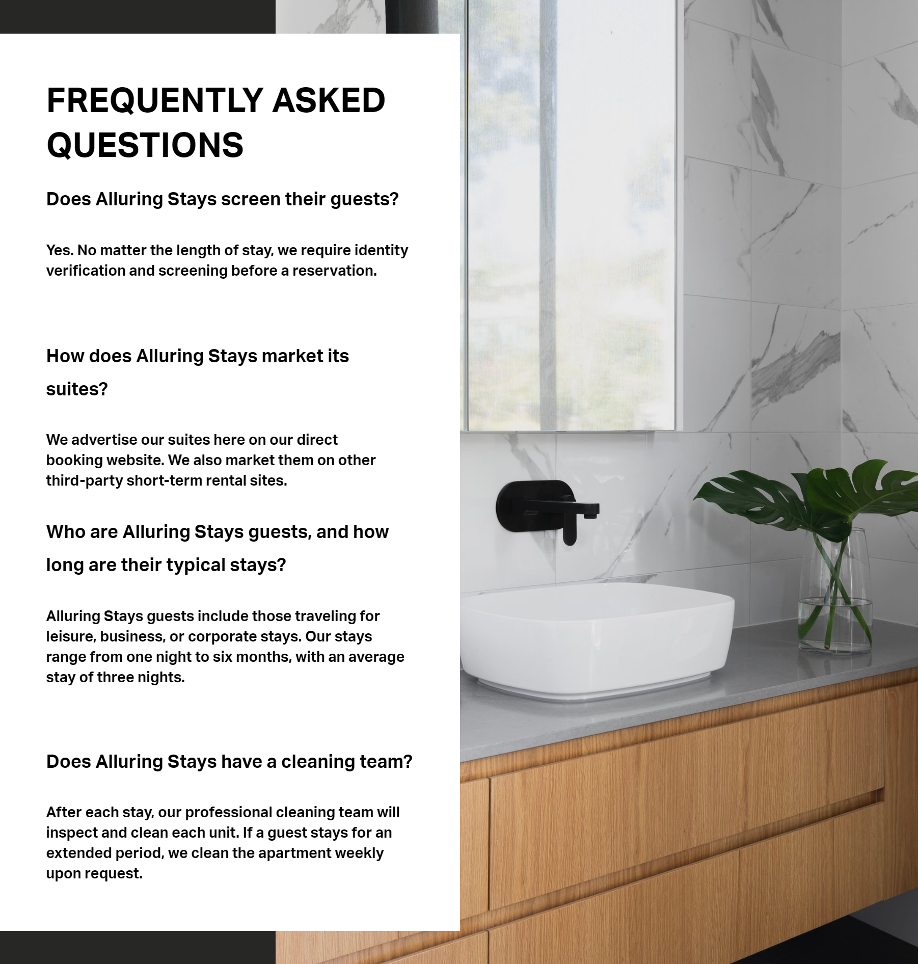 Our guests find comfort, quality, and safety at every stay. Our local teams at each location work hard to maintain a consistent quality experience for each guest. Alluring StayCation is available 24/7 via text or phone call to answer any questions, concerns, or accommodations.